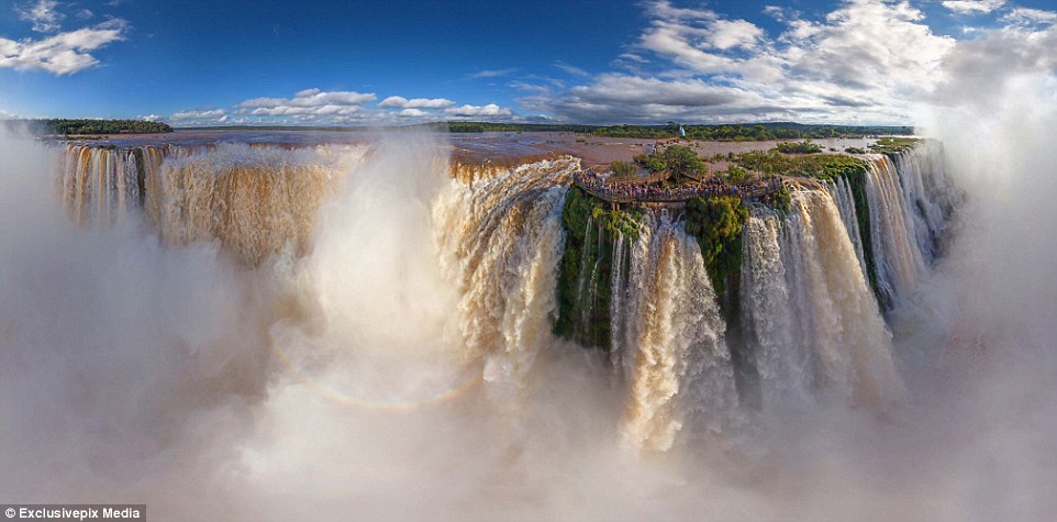 ब्राजिल र अर्जेन्टिनाको सिमानामा रहेको इगोउजु झरना । बिचमा पर्यटकहरुमा दृष्यावलोकन गरिरहेका छन् ।