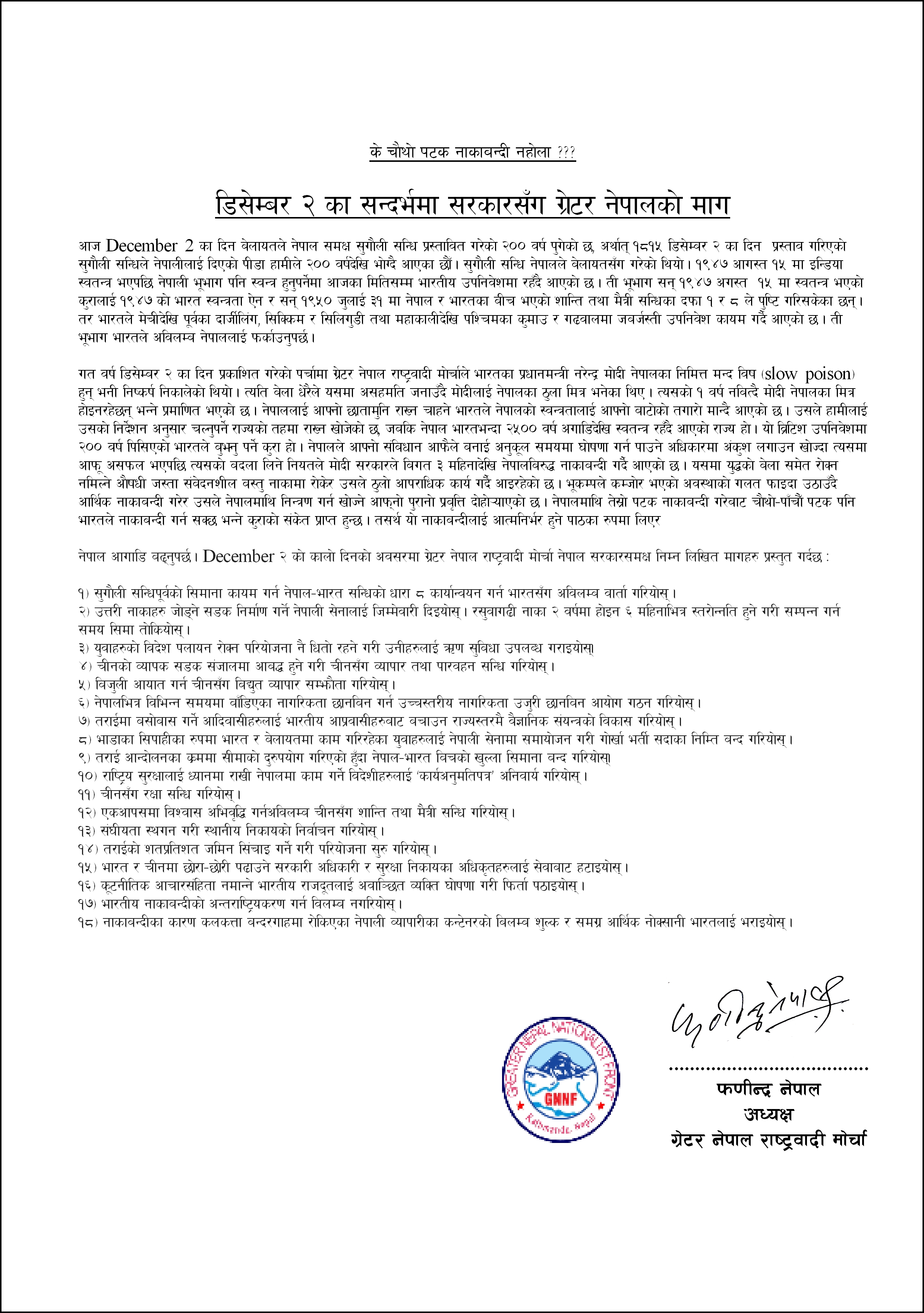 गत वर्ष डिसेम्बर २ का दिन प्रकाशित गरेको पर्चामा ग्रेटर नेपाल राष्ट्रवादी मोर्चाले भारतका प्रधानमन्त्री नरेन्द्र मोदी नेपालका निमित्त मन्द विष ( slow poison) हुन् भनी निष्कर्ष निकालेको थियो । त्यति बेला धेरैले यसमा असहमति जनाउँदै मोदीलाई नेपालका ठुला मित्र भनेका थिए । त्यसको १ वर्ष नबित्दै मोदी नेपालका मित्र होइनरहेछन् भन्ने प्रमाणित भएको छ । नेपाललाई आफ्नो छातामुनि राख्न चाहने भारतले नेपालको स्वन्त्रतालाई आफ्नो बाटोको तगारो मान्दै आएको छ । उसले हामीलाई उसको निर्देशन अनुसार चल्नुपर्ने राज्यको तहमा राख्न खोजेको छ, जबकि नेपाल भारतभन्दा २५०० वर्ष अगाडिदेखि स्वतन्त्र रहँदै आएको राज्य हो । यो व्रिटिश उपनिवेशमा २०० वर्ष पिसिएको भारतले बुझ्नु पर्ने कुरा हो । नेपालले आफ्नो संबिधान आफैले बनाई अनुकूल समयमा घोषणा गर्न पाउने अधिकारमा अंकुश लगाउन खोज्दा त्यसमा आफू असफल भएपछि त्यसको बदला लिने नियतले मोदी सरकारले बिगत ३ महिनादेखि नेपालबिरुद्ध नाकाबन्दी गर्दै आएको छ । यसमा युद्धको बेला समेत रोक्न नमिल्ने औषधी जस्ता संबेदनशील बस्तु नाकामा रोकेर उसले ठुलो आपराधिक कार्य गर्दै आइरहेको छ । भूकम्पले कम्जोर भएको अवस्थाको गलत फाइदा उठाउँदै आर्थिक नाकाबन्दी गरेर उसले नेपालमाथि निन्त्रण गर्न खोज्ने आफ्नो पुरानो प्रबृत्ति दोहो¥याएको छ । नेपालमाथि तेस्रो पटक नाकाबन्दी गरेबाट चौथो–पाँचौँ पटक पनि भारतले नाकाबन्दी गर्न सक्छ भन्ने कुराको संकेत प्राप्त हुन्छ । तसर्थ यो नाकाबन्दीलाई आत्मनिर्भर हुने पाठका रुपमा लिएर नेपाल आगाडि बढ्नुपर्छ । म्भअझदभच २ को कालो दिनको अवसरमा ग्रेटर नेपाल राष्ट्रवादी मोर्चा नेपाल सरकारसमक्ष निम्न लिखित मागहरु प्रस्तुत गर्दछ ः